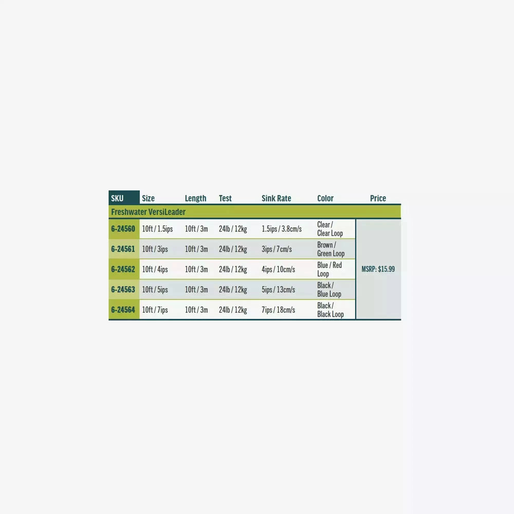 RIO's Freshwater VersiLeaders are designed for the fly fisher who needs a quick-change option for converting a floating line to a sink tip. Each VersiLeader is 10ft long, tapered for the best in performance and has a 24lb nylon core. A neat, bullet-proof welded loop at the butt end allows for fast rigging. The leaders have the following sink rates: